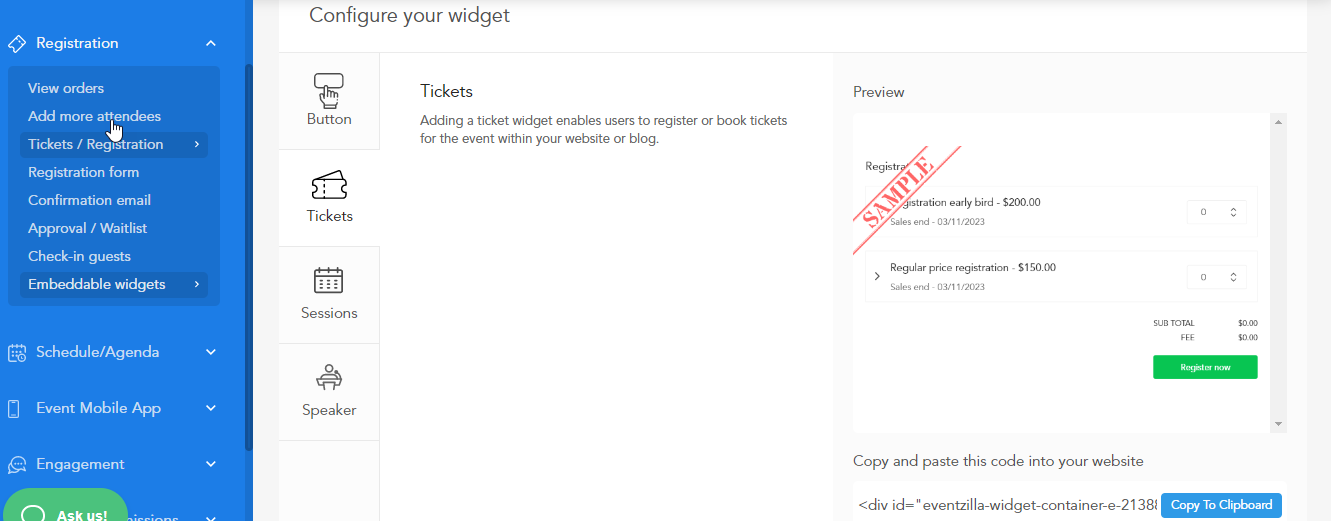 Tickets widget – Adding this widget allows you to sell your event tickets or accept registrations within your website or blog. In short, your attendees won’t be redirected outside the registration flow and they can complete within your website or blog.