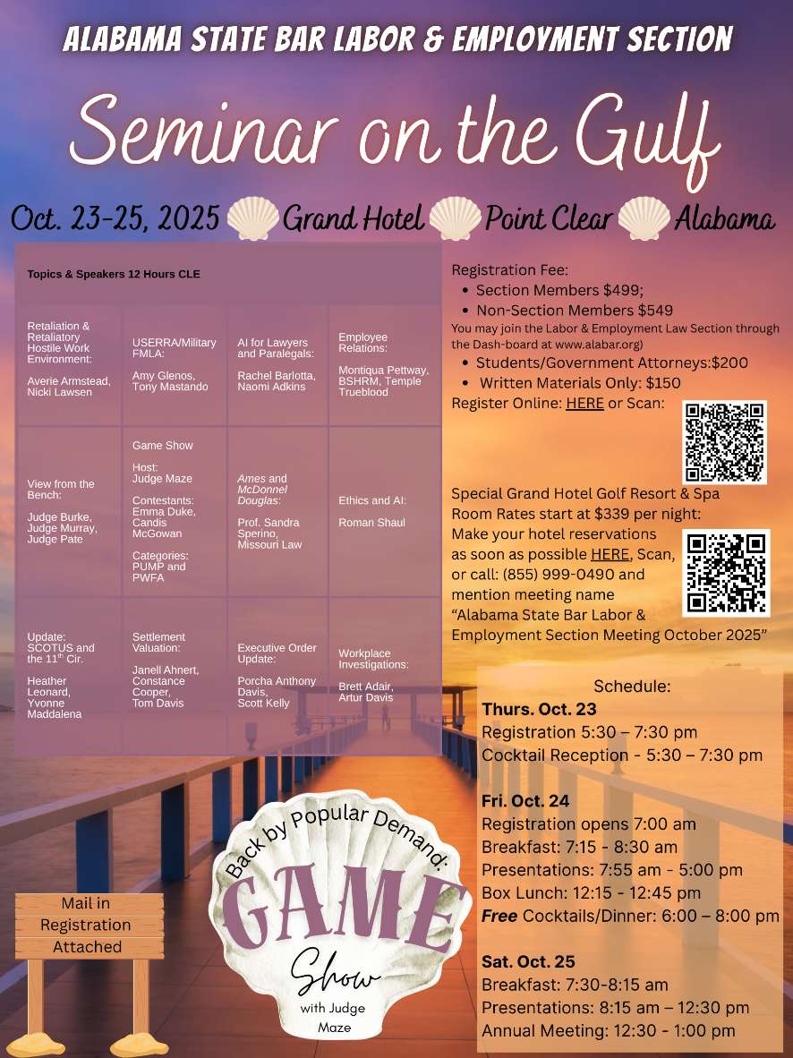 Special Grand Hotel Golf Resort & Spa room rates start at $339 per night. Make your hotel reservations as soon as possible by clicking HERE, or call 1-855-999-0490 and mention the meeting name "Alabama State Bar Labor & Employment Section Meeting October 2025"