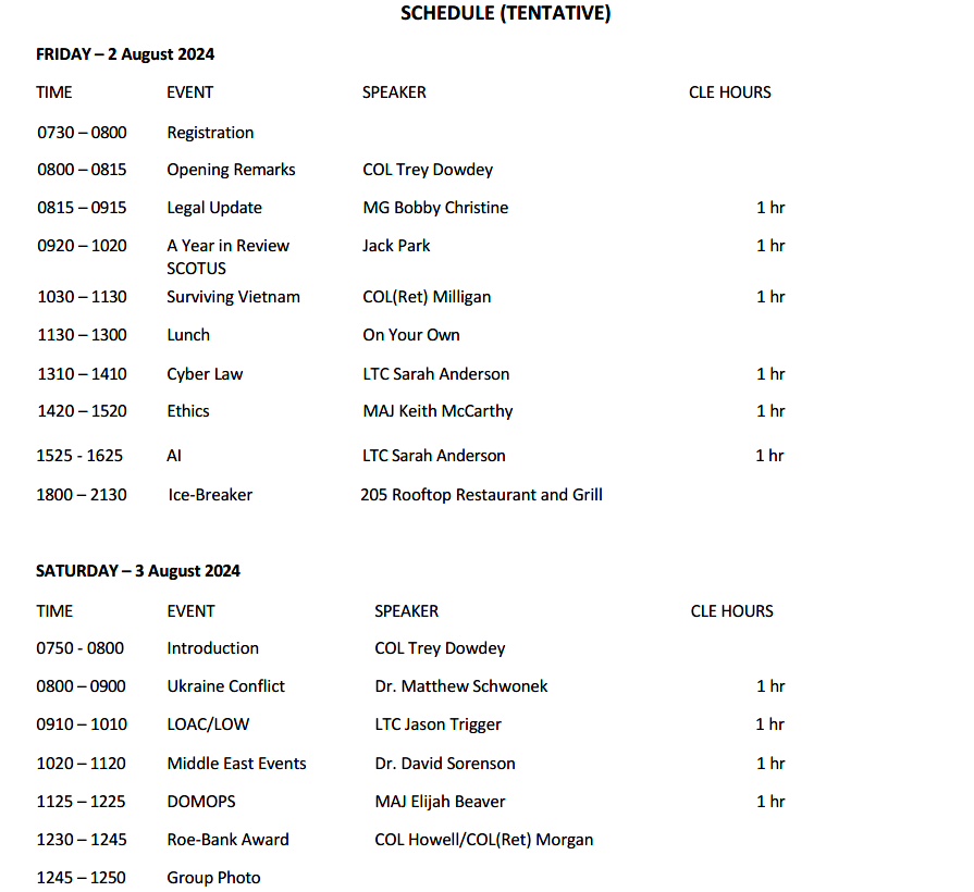 The Military Law Committee of the Alabama State Bar invites you and any of your fellow attorneys and paralegals to attend the 34th Annual Alabama Military Law Symposium. Attendees will participate in a two-day event where they will learn about the present state of the National Guard and Army Reserves; receive legal updates on more than five topics, including ethics, domestic operations, AI, and cyber law; and honor this year's Roe-Bank Award recipient.