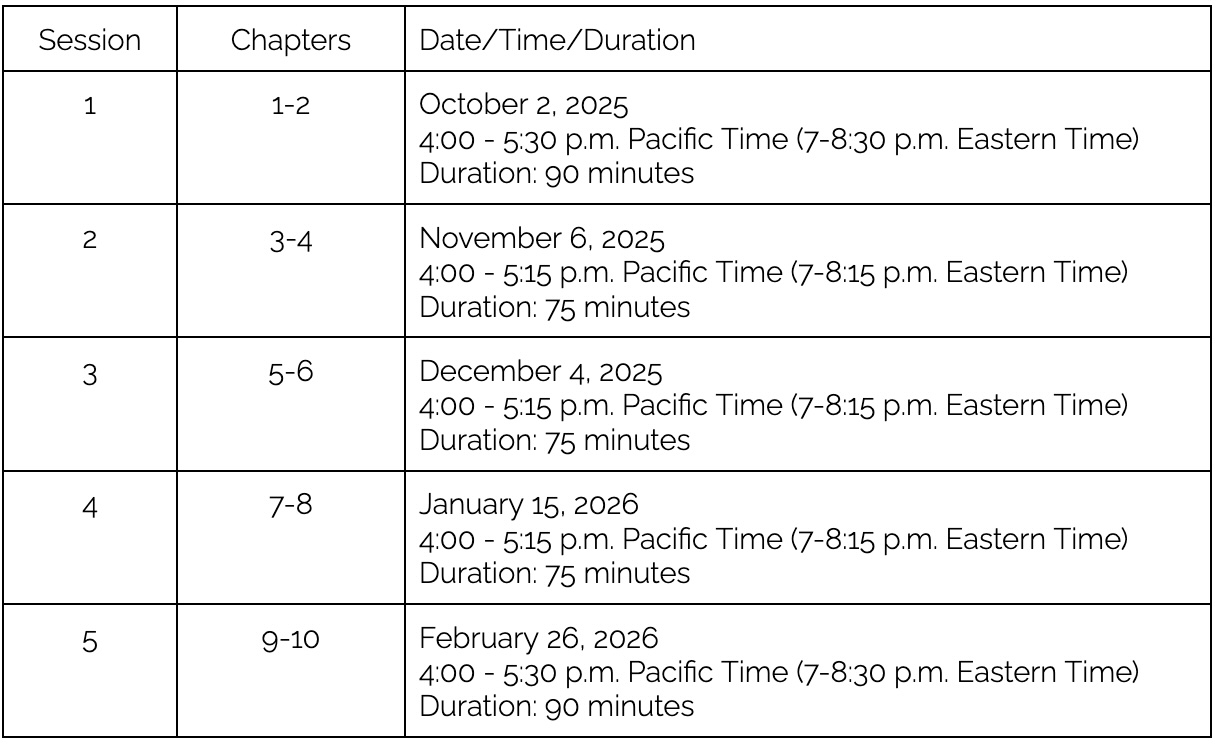Each of the 5 sessions will begin at 4:00 p.m. Pacific Time, 7:00 p.m. Eastern Time. See the grid below for the exact timing of each session.