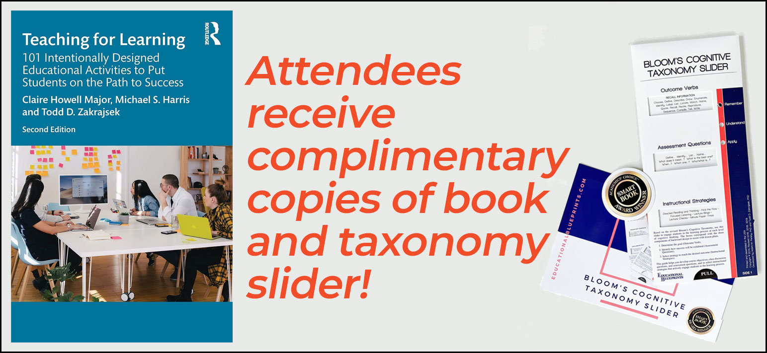 Attendees to this event will receive a complimentary copy of her book: Teaching for Learning: 101 Intentionally Designed Educational Techniques to Put Students on the Path to Success (published by Routledge, with Michael Harris and Todd Zakrajsek), and Bloom's Taxonomy Slider from Educational Blueprints.