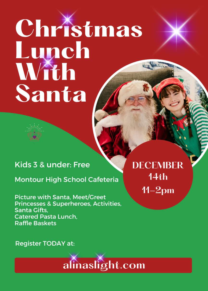 Includes: Catered Pasta Lunch, Picture with Santa, Meet/Greet Princesses & Super Heroes, Activities, Santa Gifts, Raffle Baskets