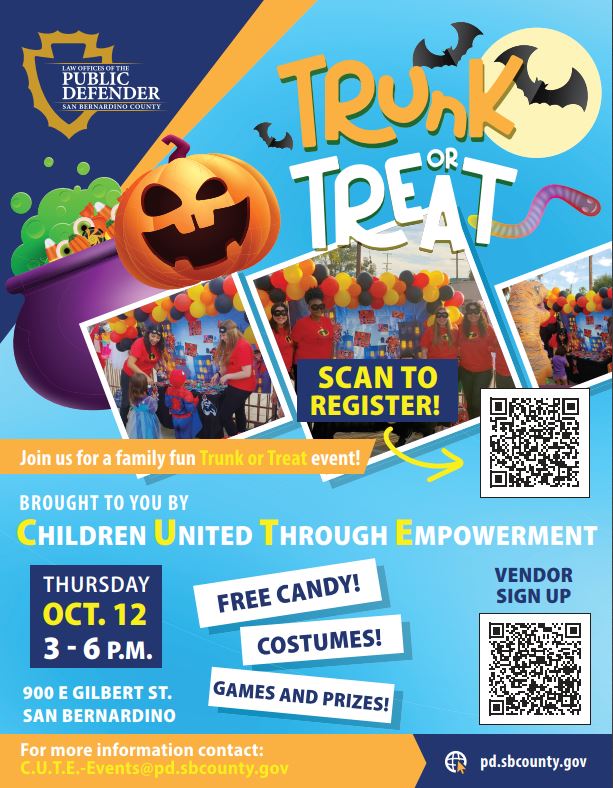 The San Bernardino County Public Defender's Office C.U.T.E program is hosting a spooktacular Halloween event on Thursday, October 12, 2023 from 3PM-6PM. Get ready for a frightfully fun evening of trunk-or-treating and Halloween festivities. Dress up in your best costume and bring your family and friends along for a ghoulishly good time. Our event promises to be a treat-filed extravaganza with creatively decorated trunks, delicious candy, and exciting games. Don't miss out on this wickedly awesome event!