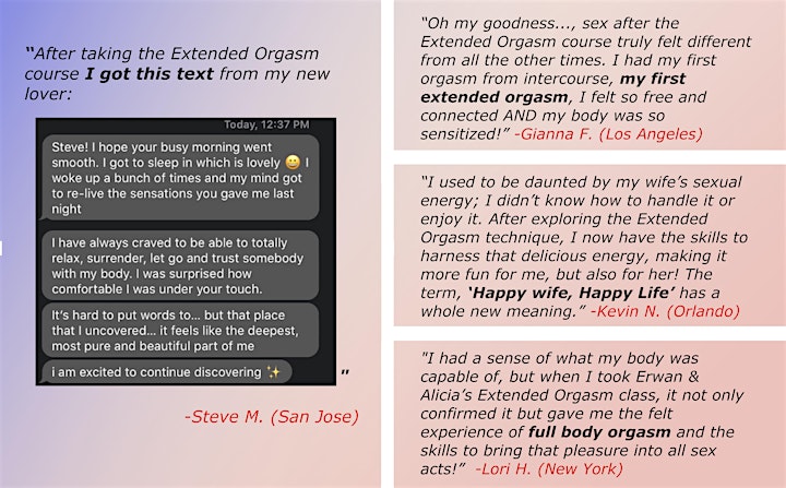 Orgasm is a very personal practice that requires real care and attention. Erwan and Alicia are the only Bay Area couple who have taught Extended Orgasm to thousands of students and helped them reach their sexual and relationship goals. As a married couple, they have been teaching singles to get into relationship and couples to thrive in relationship, with an emphasis on developing a regular practice of extended orgasm for 25 years.