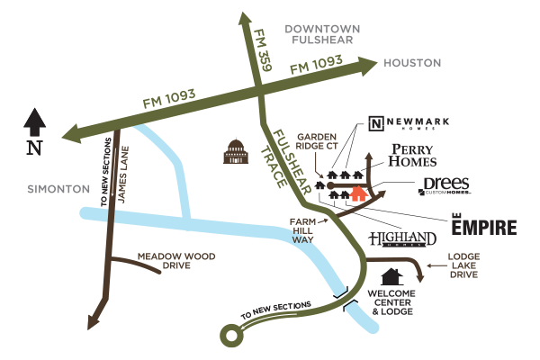 Directions: From I-10 West, Take exit 743B toward Grand Parkway and merge onto TX-99 S. Then take the FM 1093 exit after about 5 miles, and turn right at the light toward FM 1093 W. Stay on the feeder or merge onto Westpark Tollway W (toll road). In about 7 miles, turn left at the intersection of FM 1093 and FM 359 to enter the Fulbrook on Fulshear Creek community. Turn left at Farm Hill Way, and then an immediate left on Lakeview Bend. Then turn left on Garden Ridge Court.