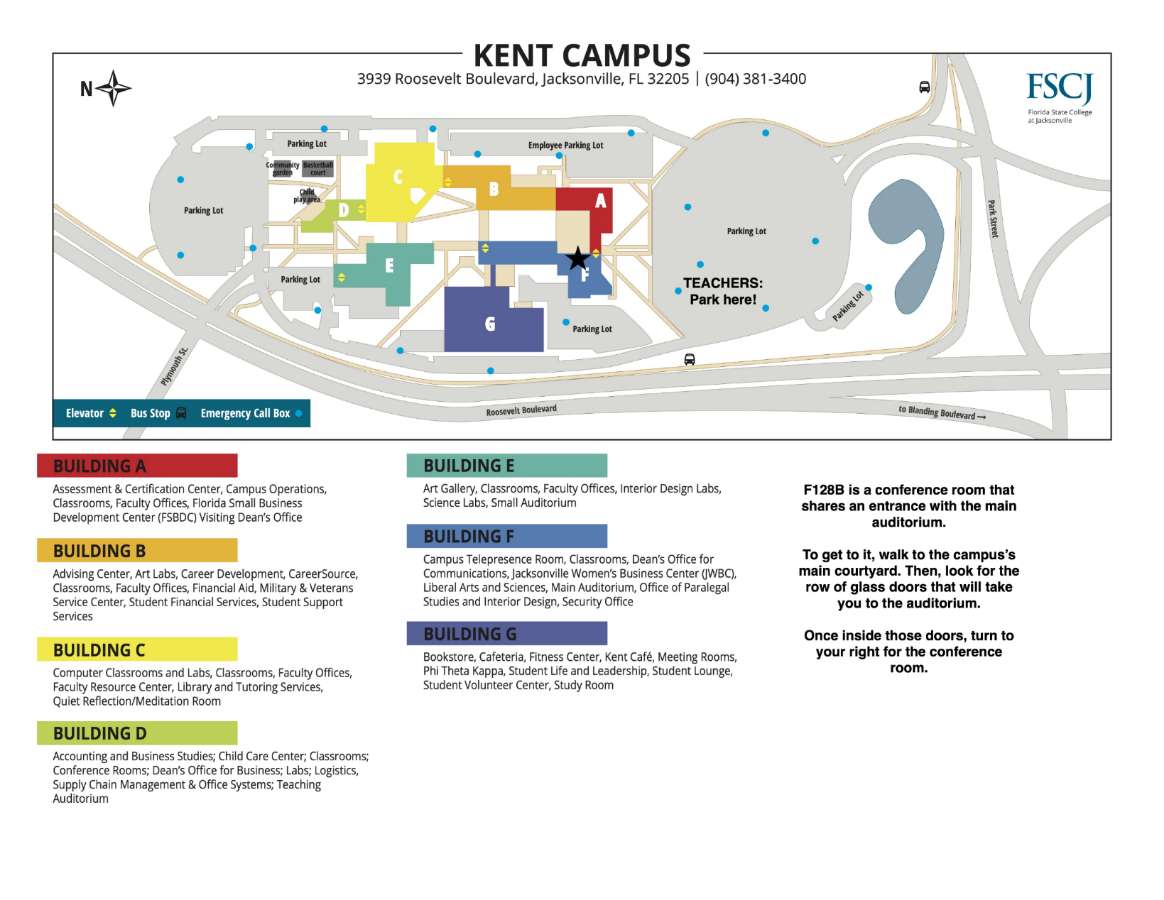 Kent Campus Map is below, with a STAR for the workshop location. We suggest that teachers park in the large parking lot at the front of the campus.