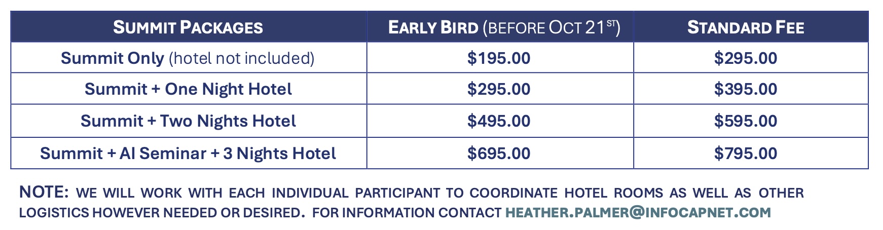 There is a nominal fee to attend which covers participants' hotel room and meals (overall costs are heavily subsidized by Infocap with the commitment this is not only a worthwhile but needed exercise for our industry). Registration includes Summit admission plus receptions, meals and hotel (based on the package you select).