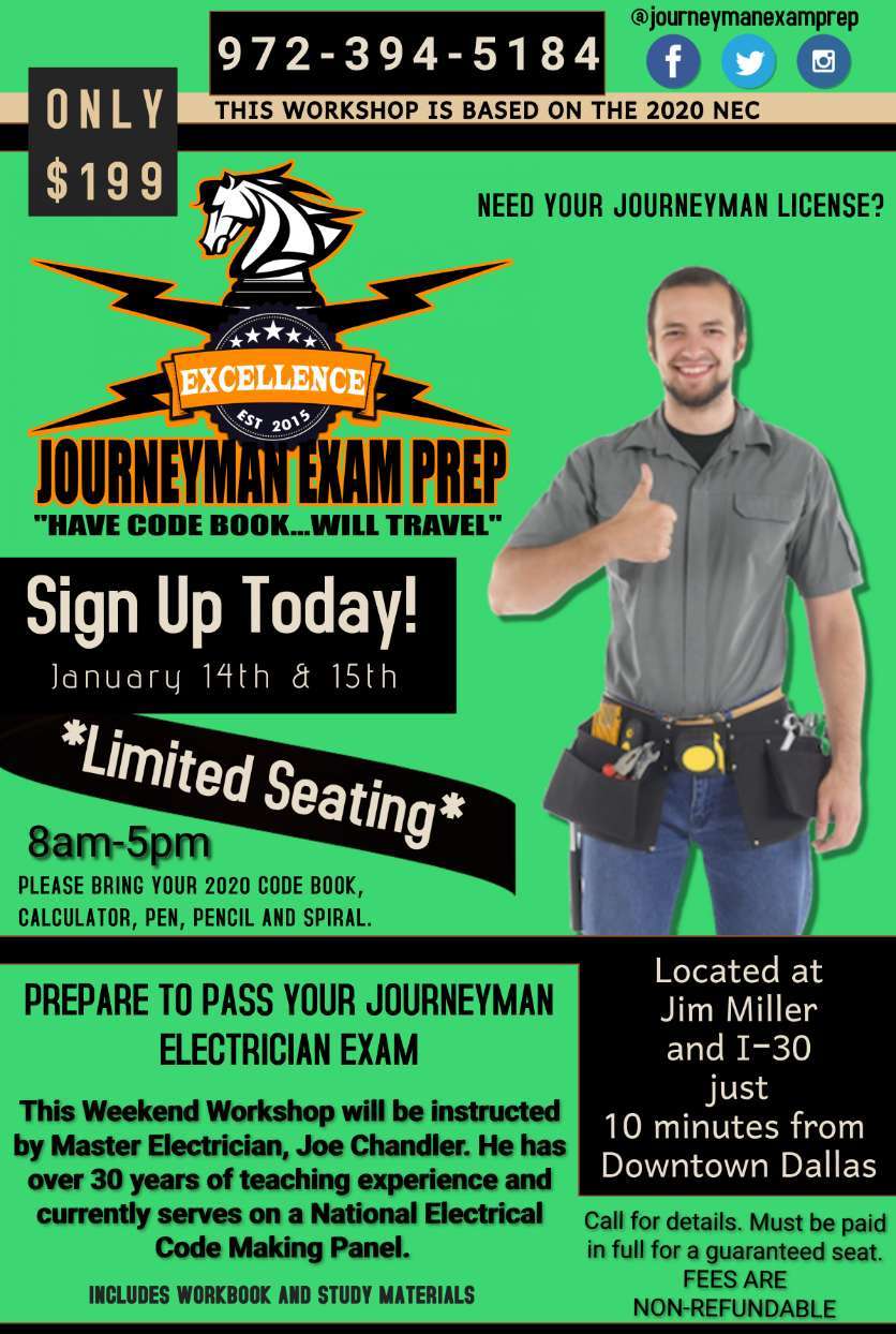 The dates for the Journeyman Exam Prep Live In Person Class will be on January 14th & 15th. We will meet on Saturday and Sunday from 8am-5pm.