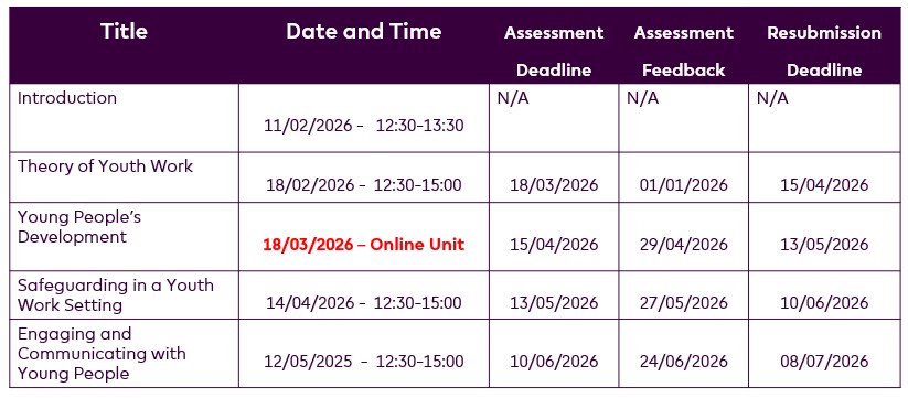 Who: Those working directly with young people and have some experience of youth work. Delegates must currently be working with young people aged 11 and above at least once a week as well as being able to provide a supervisor within their Football Club Charity that is JNC (Joint Negotiating Committee) qualified or equivalent. Supervisors will be required to attend a one-off training session and provide ongoing support (dates for that supervisor session on the following page).