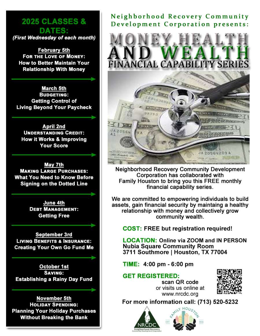 This series will be held monthly ONLINE and IN PERSON at the Nubia Square Apartments Community Room located at 3711 Southmore | Houston, TX 77004.