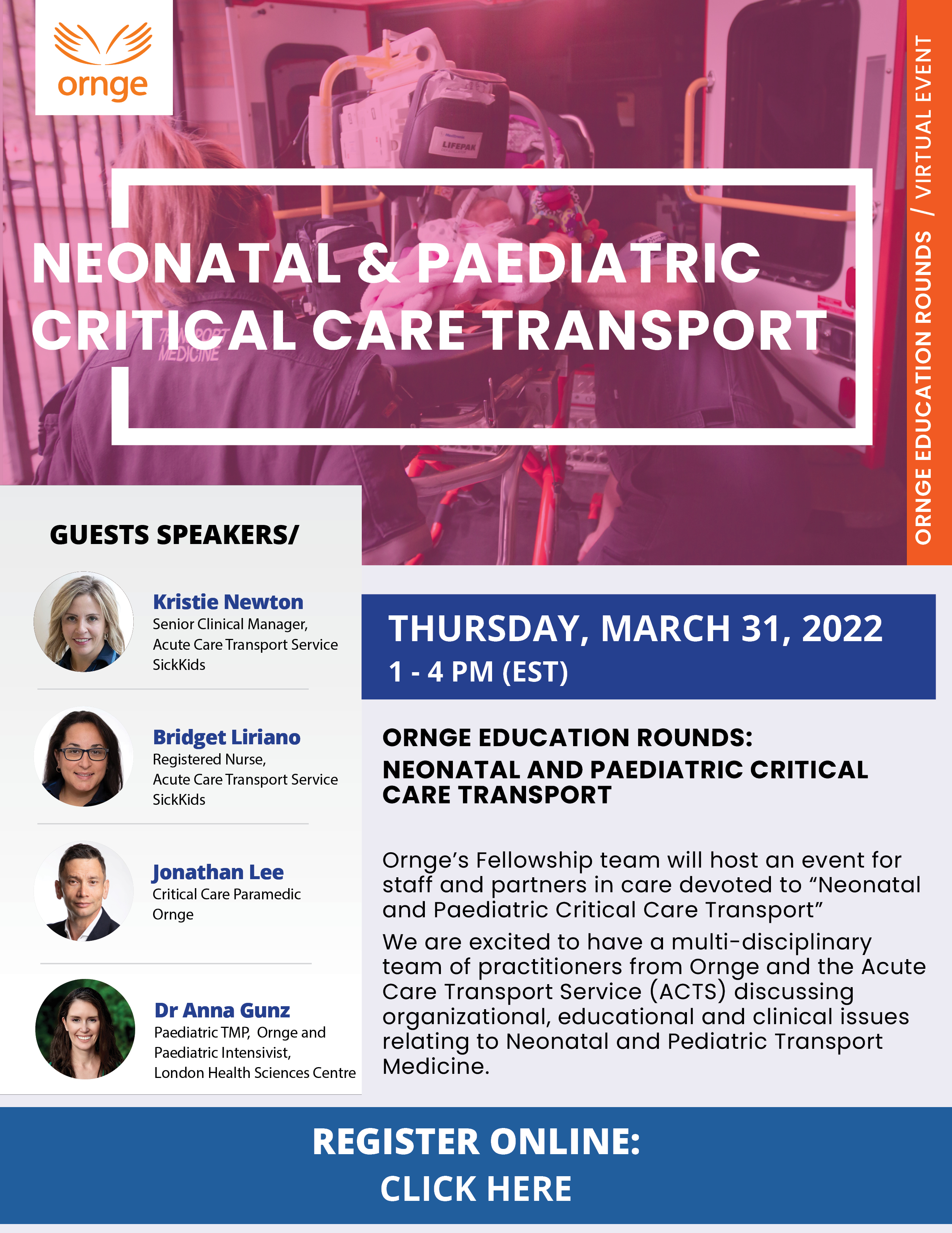 On March 31 (12 – 4PM EST), Ornge's Fellowship team will host an event for staff and partners in care devoted to "Neonatal and Paediatric Critical Care Transport"