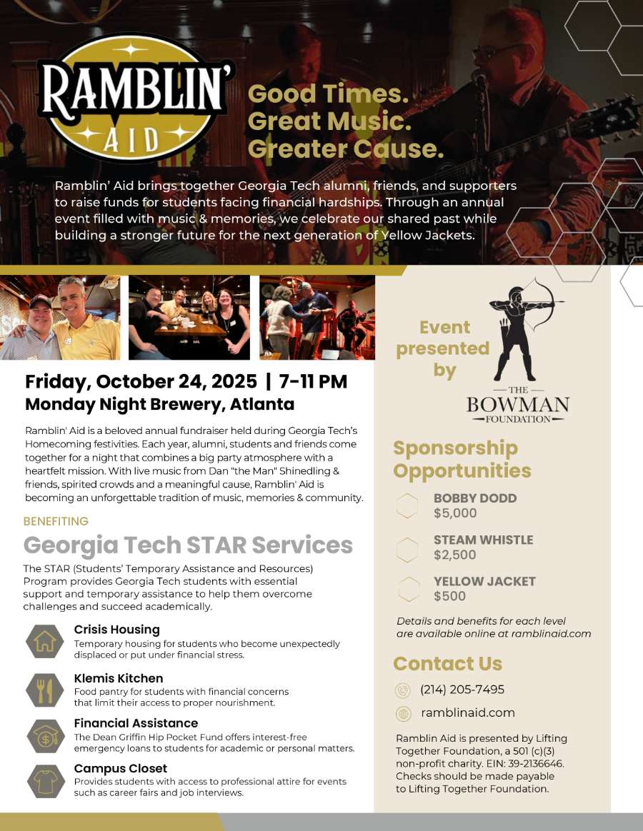 Ramblin' Aid is back for another unforgettable night during Georgia Tech’s Homecoming festivities! This beloved annual fundraiser brings together alumni, students, and friends for a high-energy celebration with a powerful mission: helping Yellow Jackets in need.