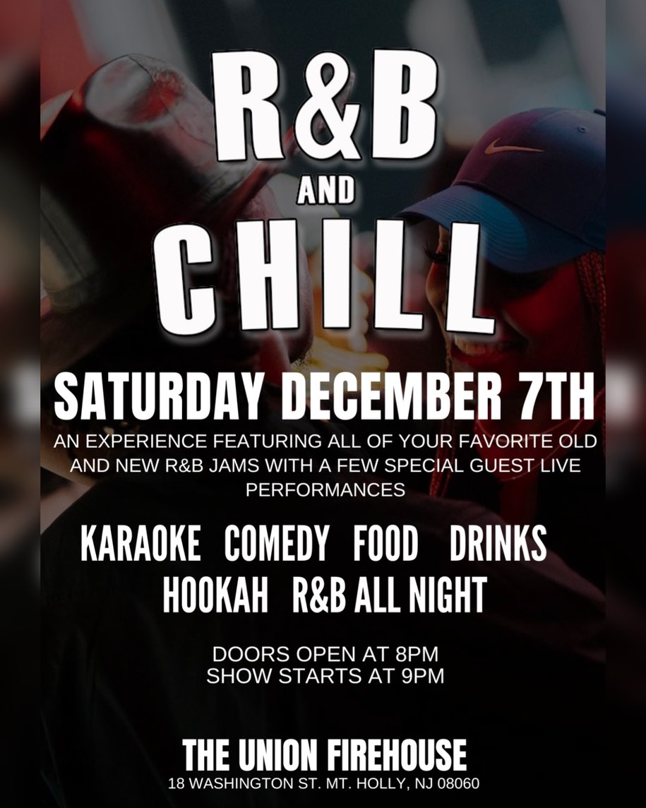 R&B And Chill is an experience featuring all of your favorite old and new R&B jams with a few special live performances! #Karaoke #Comedy #Hookah #Food #Drinks R&B ALL NIGHT!!!! The perfect date night, girls night out, birthday celebration or if you just want to come out and vibe at one of the best waves to hit south jersey! You've probably been to over a 100 r&b parties but never experienced an R&B AND CHILL party. Your definitely doing the R&B vibes wrong! Hosted by Comedian Will Wright & Music provided by no other than DJWesWill.