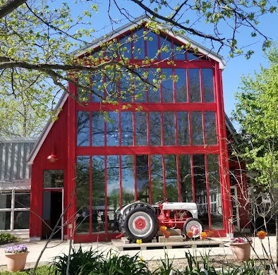 After you purchase tickets, or show your membership card, you will exit the building and come outside next to a big red tractor. We will meet just in front of there, near the miniature train set up.